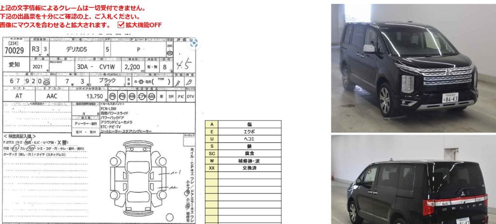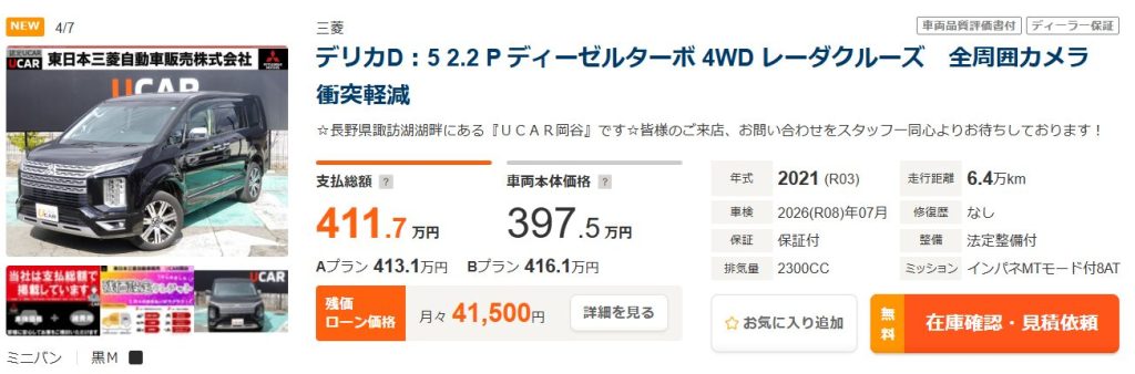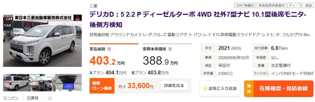 (例)デリカD5/令和3年/走行距離:約6.8万㎞の場合 デリカD5/グレード:P/令和3年/走行距離:約68,000㎞/4WD