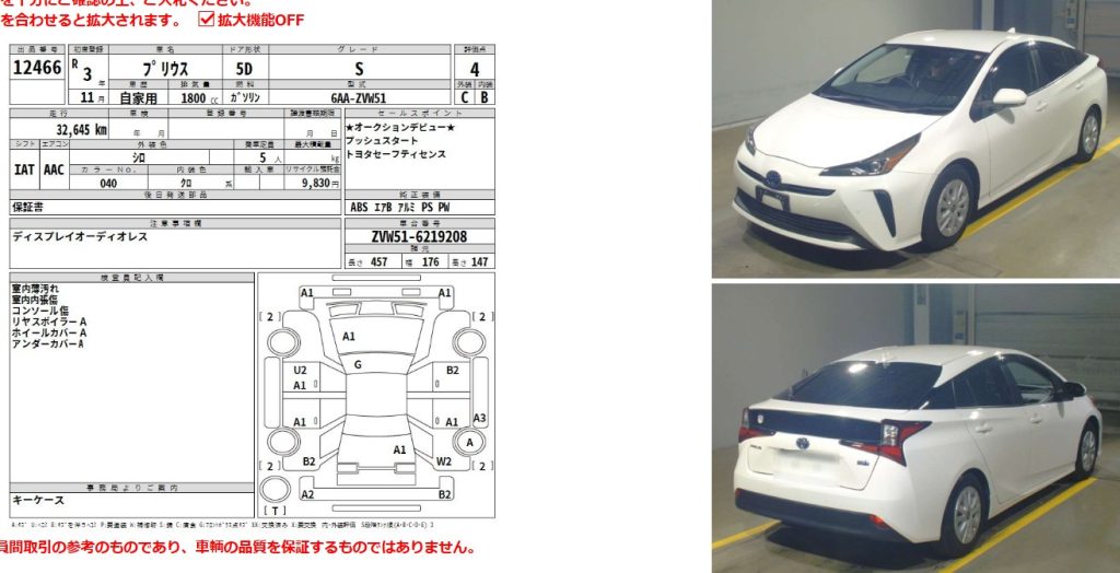 (例)プリウス/令和3年/走行距離:約3.2万㎞の場合 プリウス/グレード:S/令和3年/走行距離:約32,000㎞/2WD