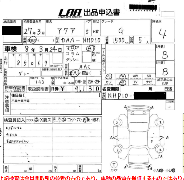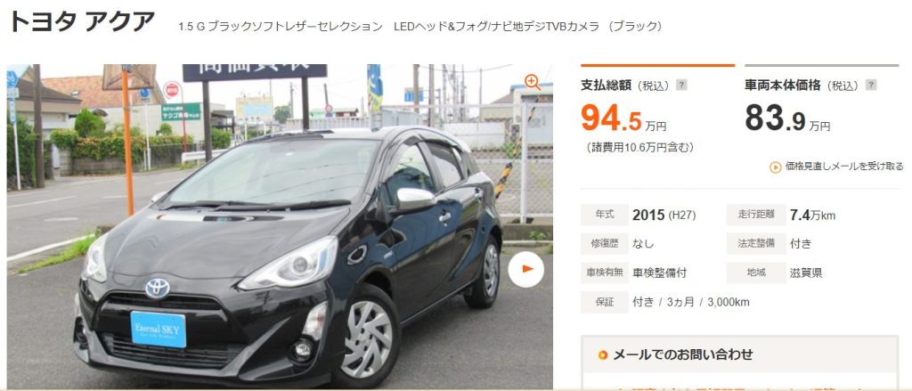 (例)アクア/平成27年/走行距離:約8万㎞の場合 アクア/グレード:G/平成27年/走行距離:約85,000㎞/2WD